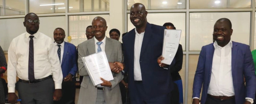 Prof. Moses Muhwezi (in a gray suit) after signing the Memorandum of [...]